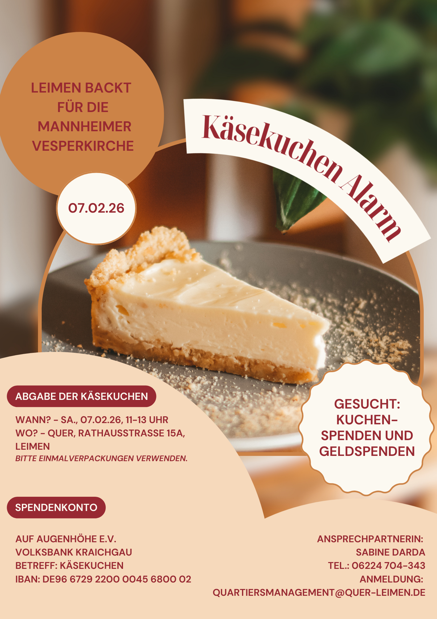 Bereits in den Jahren 2024 und 2025 haben unsere Leimener Bürger für die Vesperkirche in Mannheim Käsekuchen gebacken und wir (das QUER und Sabine Darda) möchten diese Aktion auch in 2026 starten.