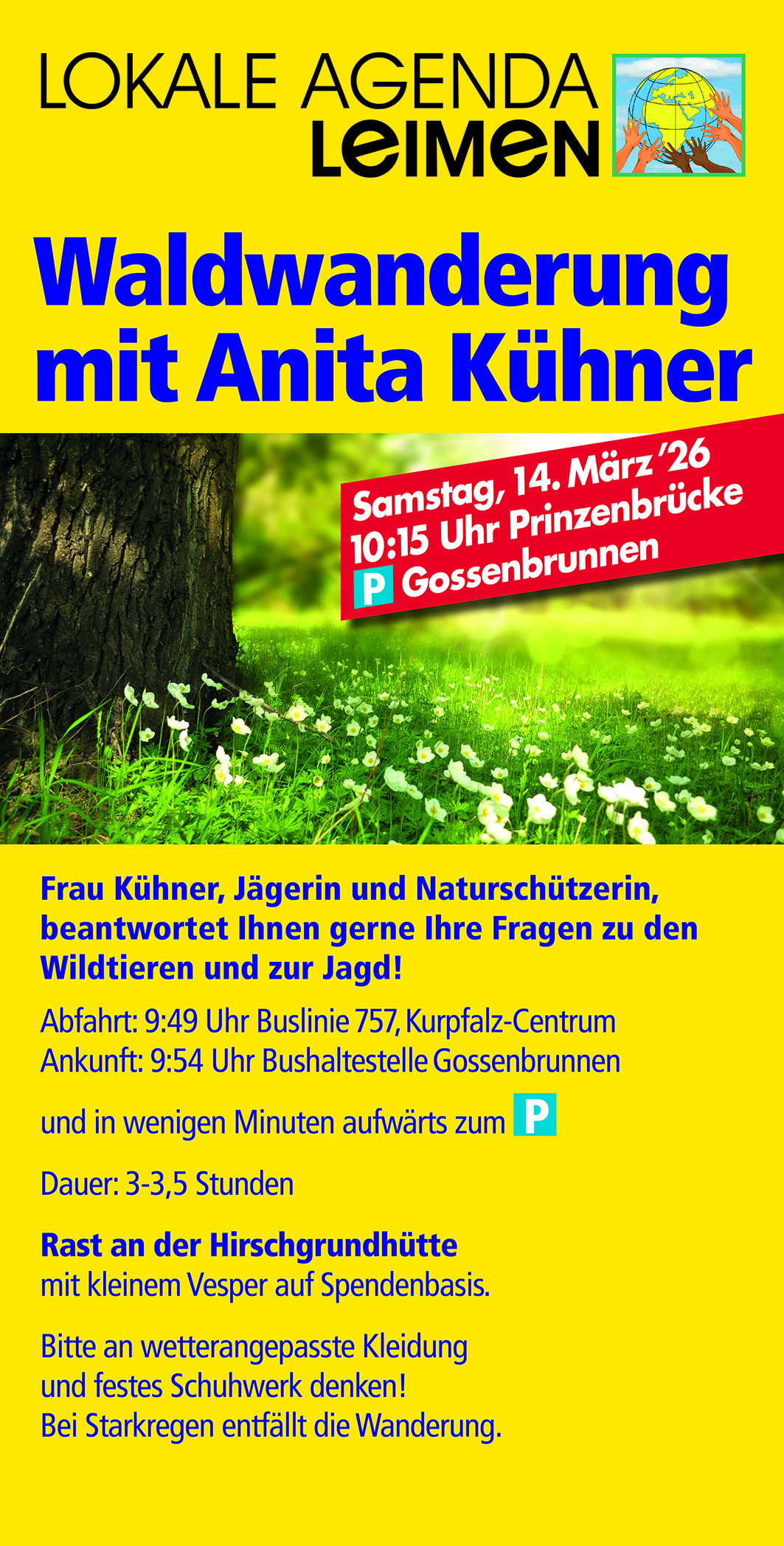 Frau Kühner, Jägerin und Naturschützerin, beantwortet Ihnen gerne Ihre Fragen zu den Wildtieren und zur Jagd! Abfahrt: 9:49 Uhr Buslinie 757, Kurpfalz-CentrumAnkunft: 9:54 Uhr Bushaltestelle Gossenbrunnen und in wenigen Minuten aufwärts zum Parkplatz Dauer: 3–3,5 Stunden Rast an der Hirschgrundhütte mit kleinem Vesper auf Spendenbasis. Bitte an wetterangepasste Kleidung und festes Schuhwerk denken!Bei Starkregen entfällt […]
