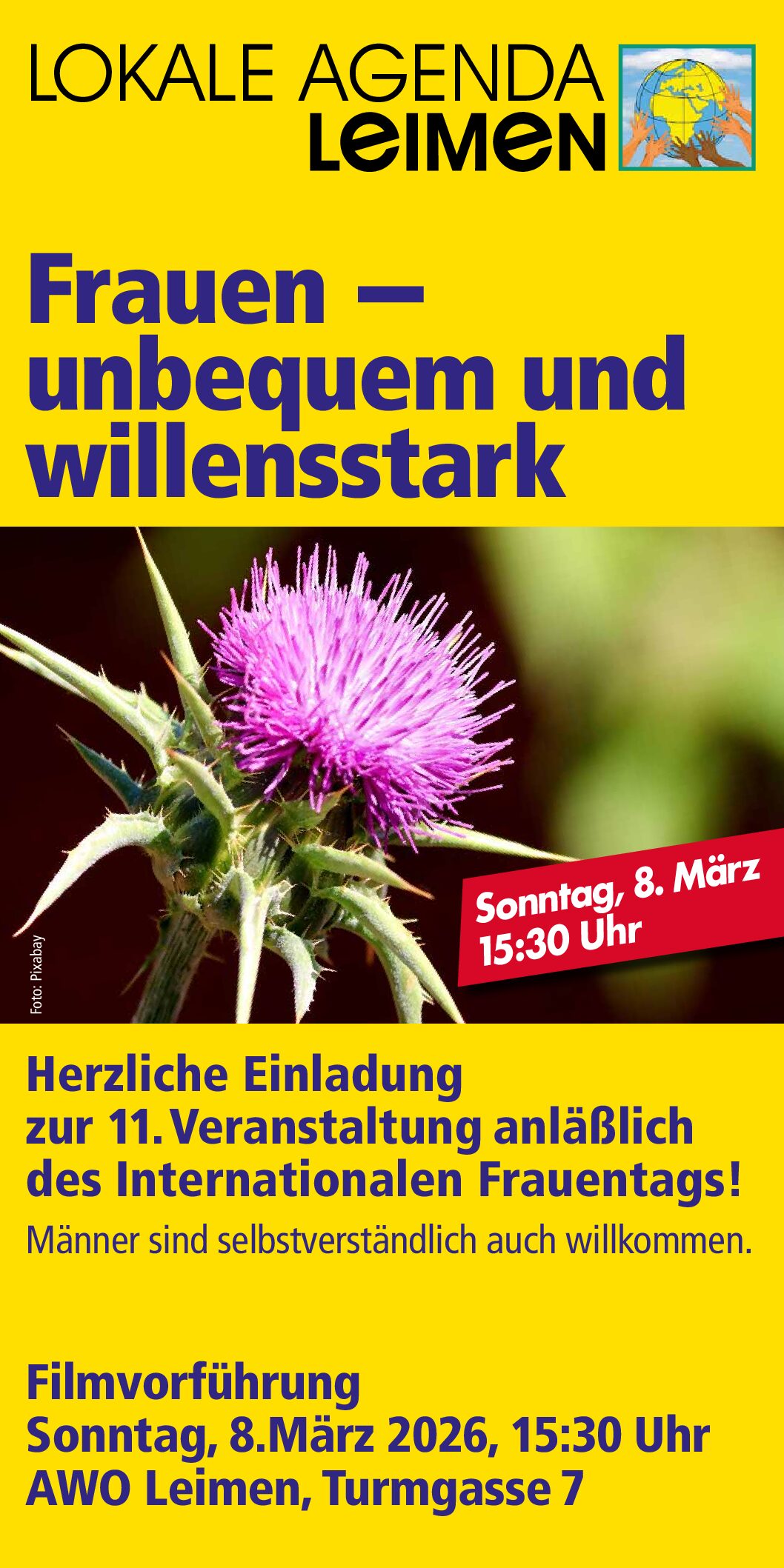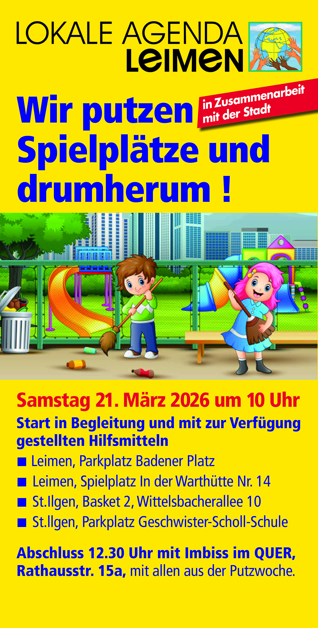 Samstag 21. März 2026 um 10 Uhr Start in Begleitung und mit zur Verfügung gestellten Hilfsmitteln Leimen, Parkplatz Badener Platz Leimen, Spielplatz In der Warthütte Nr. 14 St.Ilgen, Basket 2, Wittelsbacherallee 10 St.Ilgen, Parkplatz Geschwister-Scholl-Schule Abschluss 12.30 Uhr mit Imbiss im QUER, Rathausstr. 15a, mit allen aus der Putzwoche.