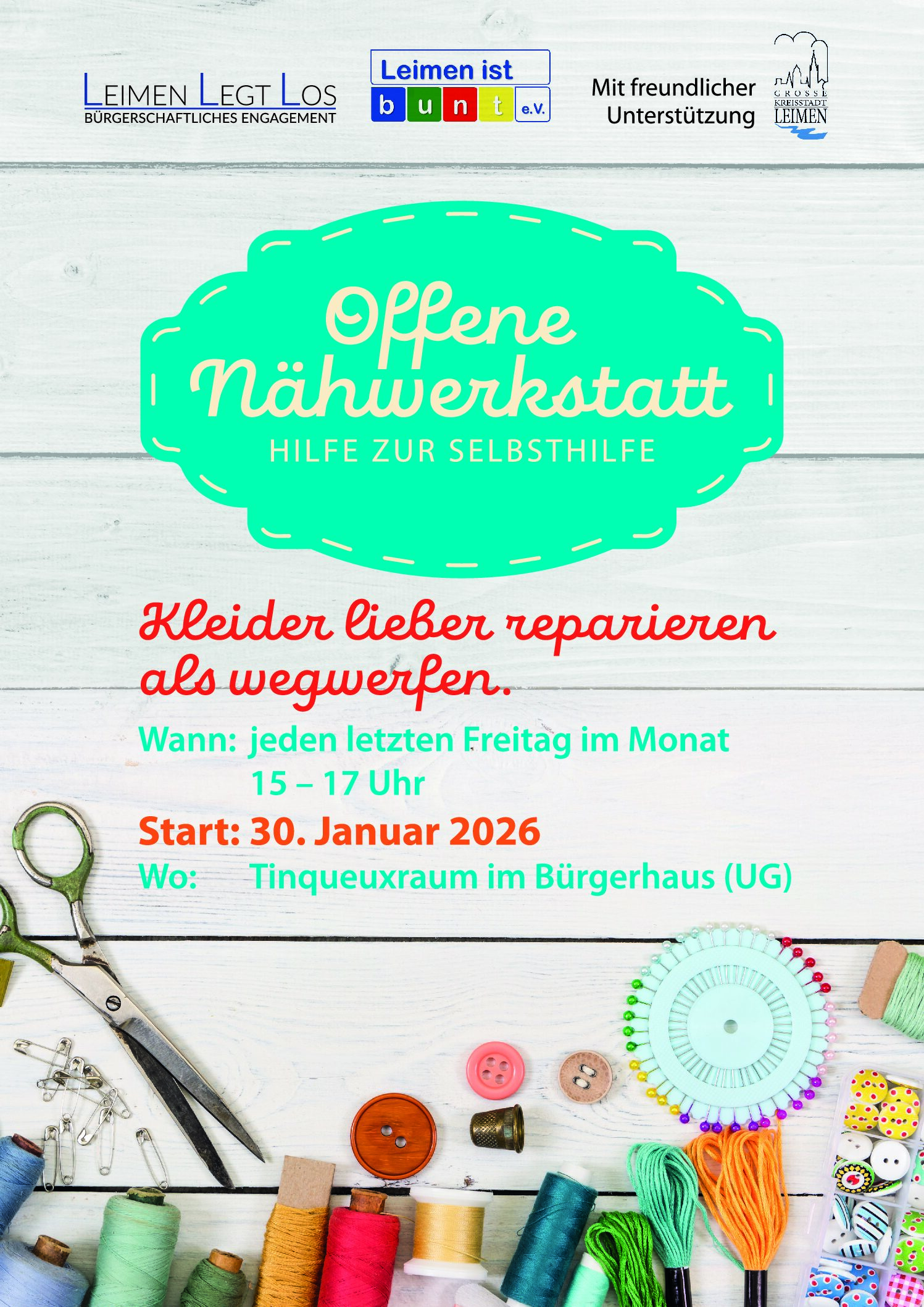 Bürgerhaus Leimen Nußlocher Straße 16, Leimen, DeutschlandOffene Nähwerkstatt – reparieren statt wegwerfen Jeden letzten Freitag im Monat Tinqueux-Raum im Bürgerhaus (UG) Wer kennt das nicht? Das Shirt hat ein winziges Loch, die Ärmel der Bluse sind […]