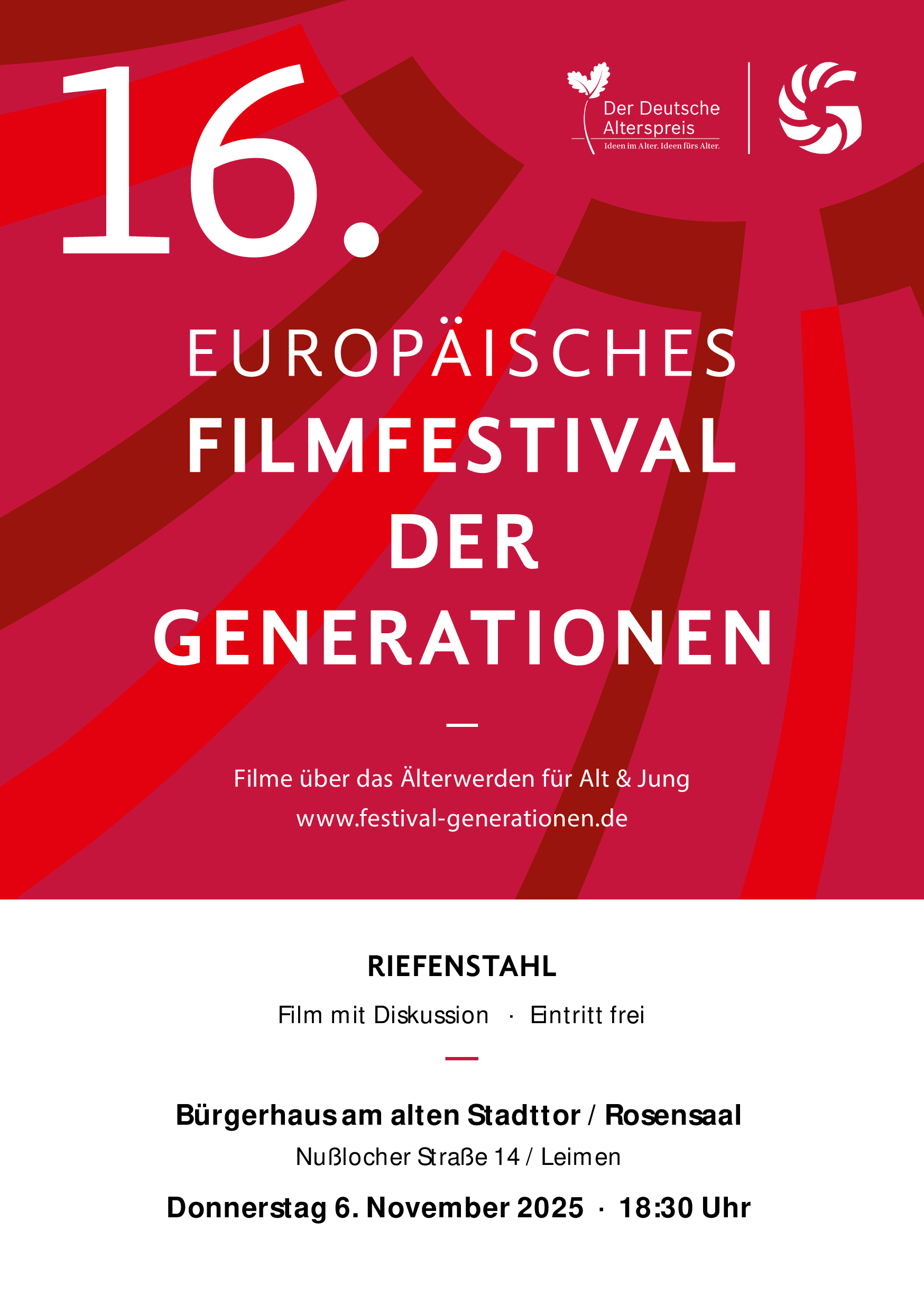 Bürgerhaus „Am alten Stadttor“ Nußlocher Str.RIEFENSTAHL Portrait einer umstrittenen Frau zwischen Filmkunst und Nazi-Ideologie Regie: Andres Veiel — Doku · Deutschland 2024 · 115 Min. — mit Leni Riefenstahl — Altersempfehlung: ab 16 Jahren Hitler und Goebbels schätzten und protegierten sie als wertvolle Gehilfin für ihre Nazi-Ideologie. Mit den Dokumentarfilmen TRIUMPH DES WILLENS (1934) über den 6. Reichsparteitag der NSDAP […]