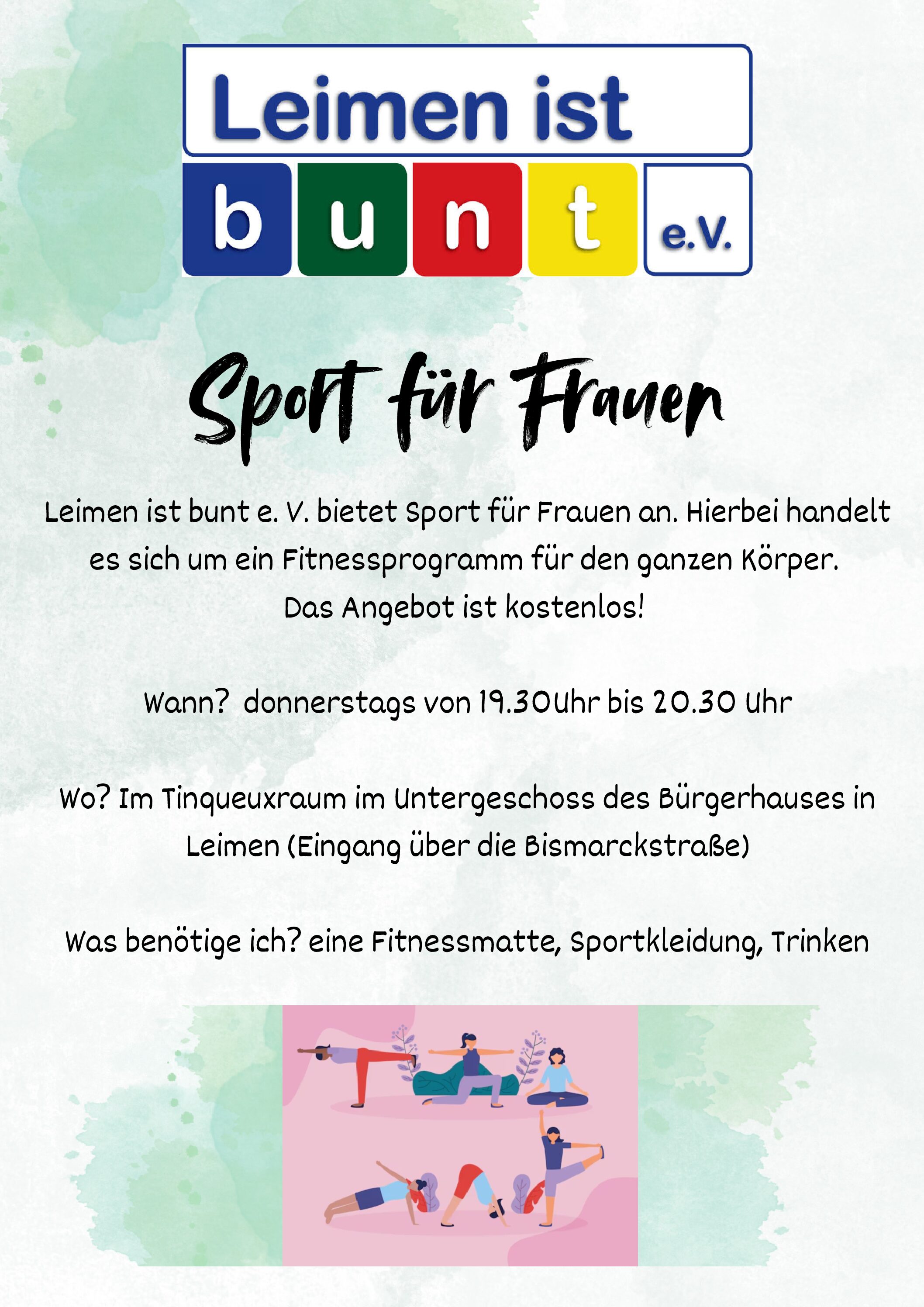 6. November @ 19:30 Uhr - 20:30 Uhr Sport für Frauen Sport für Frauen Bürgerhaus Leimen Nußlocher Straße 16, Leimen, Deutschland
